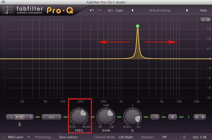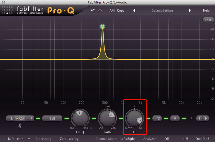 - Increase the Bandwidth so that you’re only effecting a small range of frequencies (in this case with the Q knob). (see image 2)