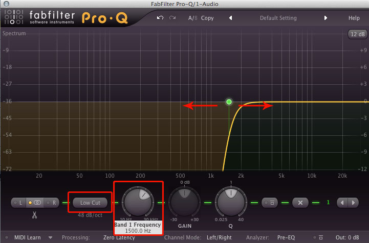 - Use a Low Cut filter (also known as High Pass) to identify the cutoff point in which you want to turn the frequencies up. In this case we want to turn up the frequencies above 1500 Hz. (Hint: You can also use a stereo spectrum analyzer in conjunction with your ears to help guide you.) (see image 5)